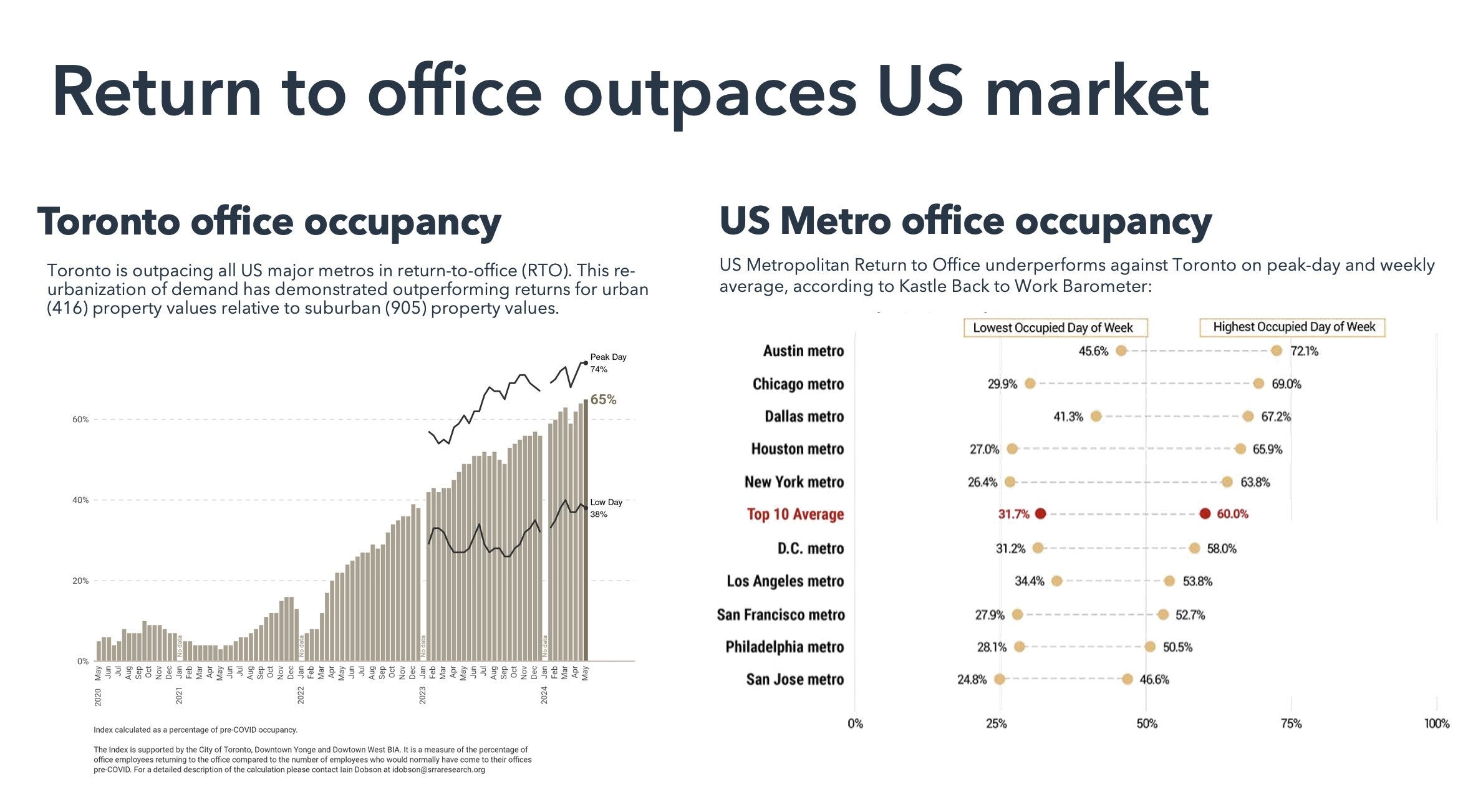 According to data from SRRA and Kastles, the return to office in Toronto is now outpacing many American metros. On both the peak and low day, office attendance is 10% higher in Toronto over NYC.