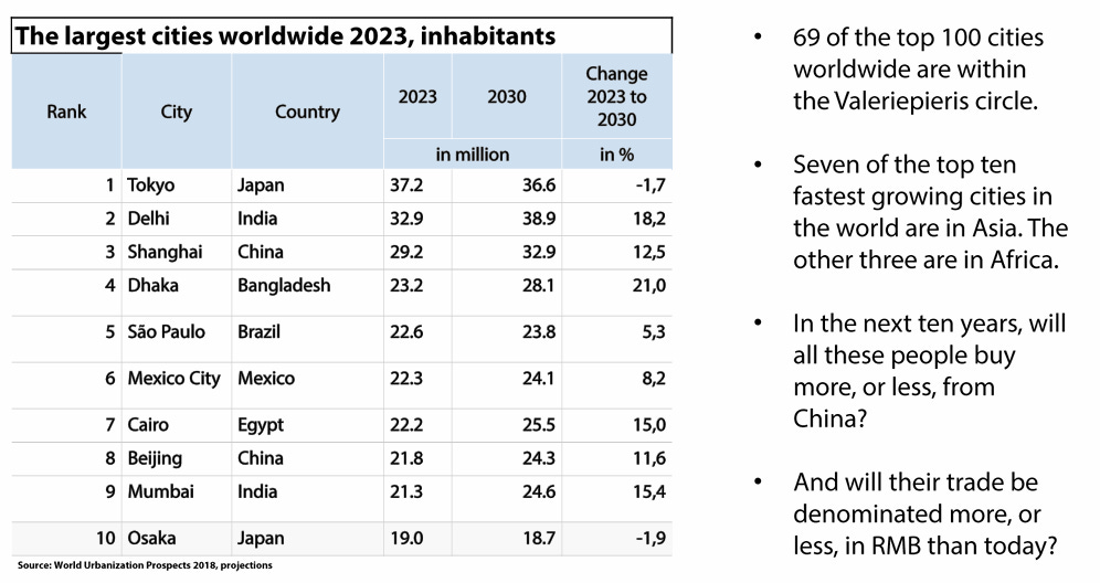 69 out of the top 100 largest cities and half the world’s population lives in this circle (Valeriepieris circle).