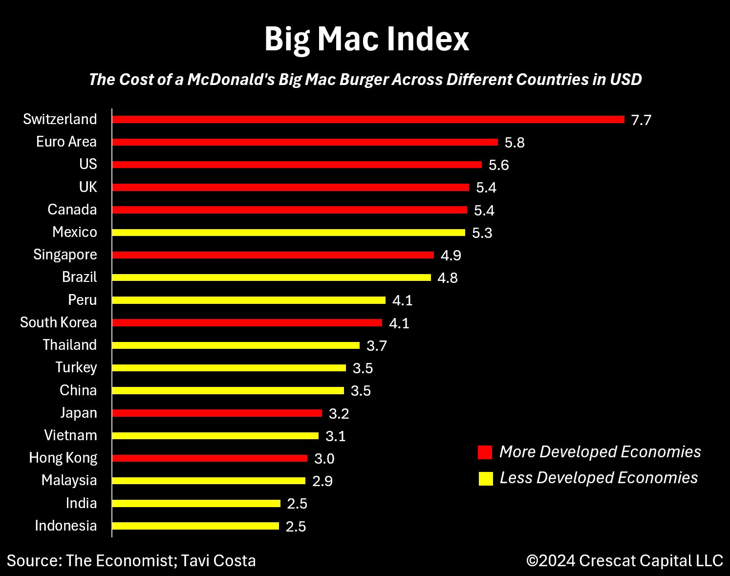 According to the Big Mac index, Asian currencies are cheap. Russell Napier had a cool comment on this, if you want to find a currency to short, go to the Rockefeller Center at Christmas, listen to the languages being spoken. If you notice a trend, the visitors who can afford that trip may have an overvalued currency.
