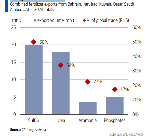 The Gulf accounts for roughly half of global sulfur trade and over a third of urea exports. Fertilizer is rising alongside energy. (@AzizSapphire)