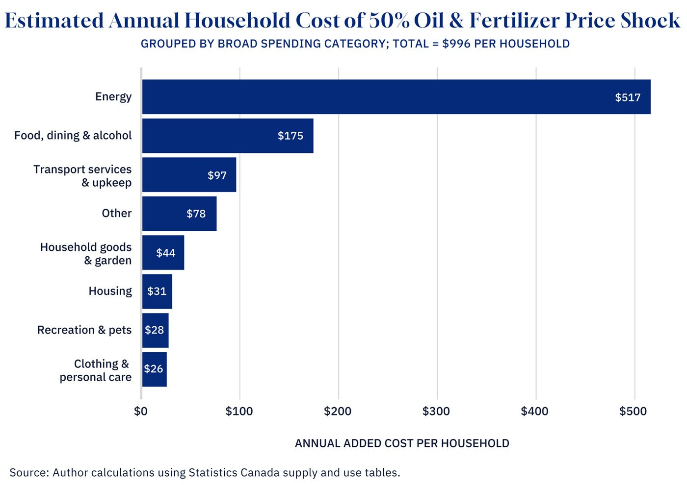 That feeds inflation. A 50% increase in oil and fertilizer could add roughly $1,000 per year to the average Canadian household. The inflation story is not over. (Trevor Tombe)