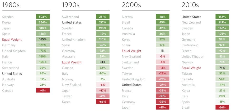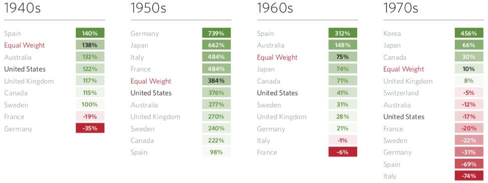 Consider the current market rhetoric of “American exceptionalism”. The current market view is that the US will continue to outperform but looking at the tables below, performance is random and you rarely see an equity market outperform 2 decades in a row. The US dominated the 2010s but it was one of the weaker performers in the previous decade following the dotcom bust; it was one of the best performers in the 1990s but before that you have to look back to the 1920s to find a decade in which US equity performance was better than middling.