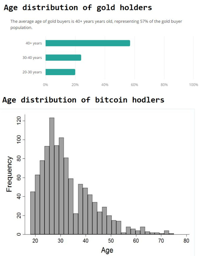 Stores of value could perform well if the DM governments decide to monetize their debts and debase their currency. Now, will gold for boomers or gold for zoomers (bitcoin) be the right horse to back? Interesting age distribution.