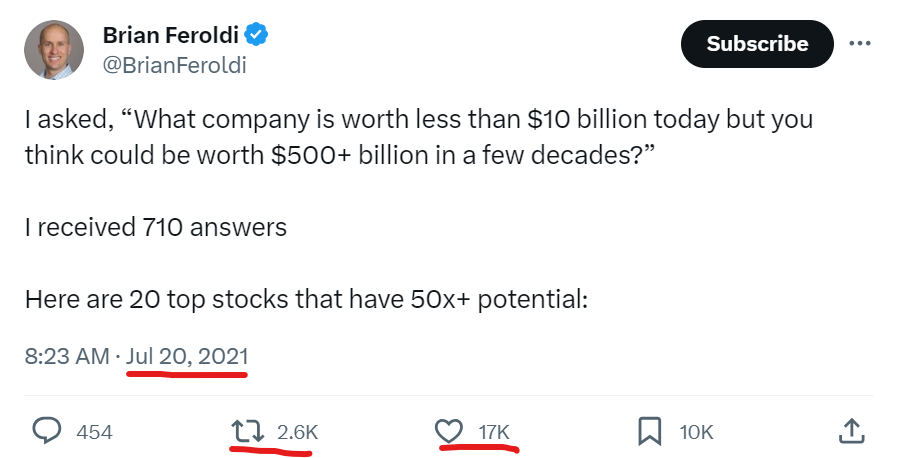Somethings that feels consensus in the moment can change rapidly. This thread during the speculative tech bubble of 2021, highlighted 20 stock ideas, “Going to $500+ B of market cap.” It didn’t end well, below are select names: