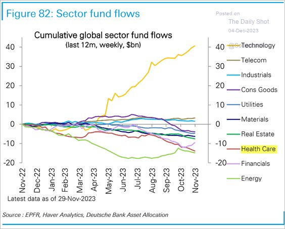 One of the few constants in this world, flows into Technology. As of late, investors have been ditching healthcare stocks.