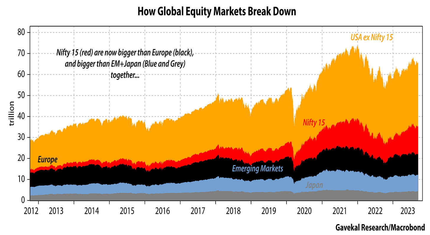 The top 15 stocks in the US are larger the entire European, Japanese and Emerging Markets equity markets.