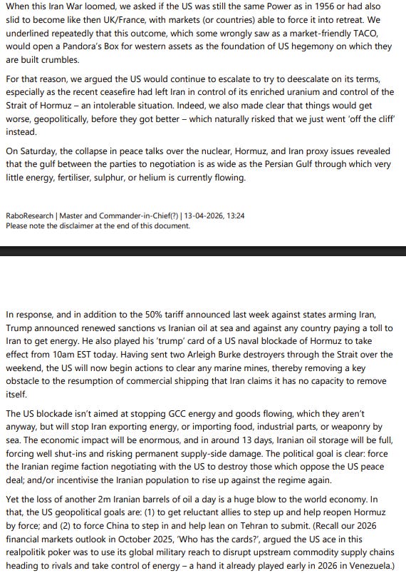Michael Every at Rabobank thinks things will escalate further before they get better, despite the all clear being signaled by markets. (Full piece)