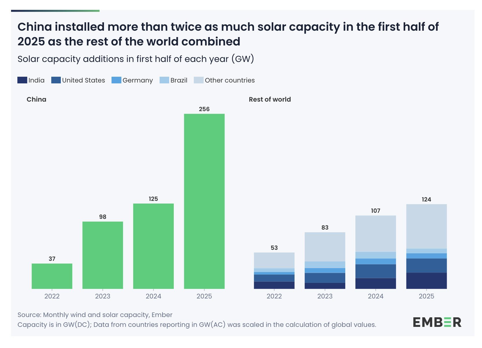 China installed twice as much solar capacity in the first half of 2025 than the rest of the world combined.