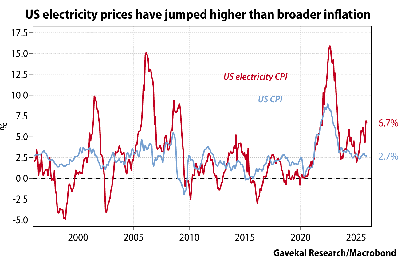 U.S. electricity prices rising at almost 7% YoY and substantially higher than broader inflation (Gavekal).