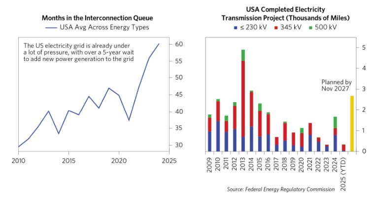 The primary constraint on U.S. energy expansion lies in grid deployment. New generation capacity faces prolonged interconnection queues that vary significantly by region, introducing risks that bridge supply chain volatility, interstate regulation, and political friction. While the U.S. aims to accelerate transmission projects, persistent congestion may force a choice: either accept material caps on demand growth or pivot toward off-grid, 'behind the meter' solutions like fuel cells and gas engines.