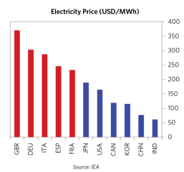 European electricity prices are broadly uncompetitive when compared to North America and especially Asia. While it might not seem like a big issue, economic activity is energy transformed, cheap energy enables productive growth. (Bridgewater)