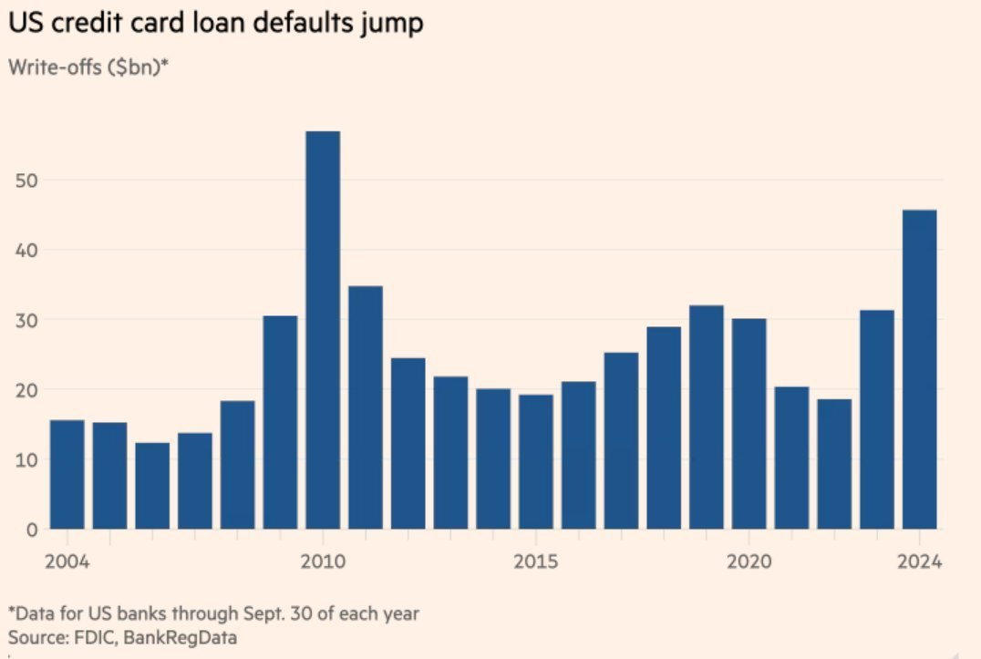 It’s not all sunshine and rainbows out there. US credit card defaults have reached their highest level since 2010, with lenders writing off $46B in seriously delinquent balances in the first nine months of 2024. This figure, up 50% from the same period last year, marks the highest level in 14 years.