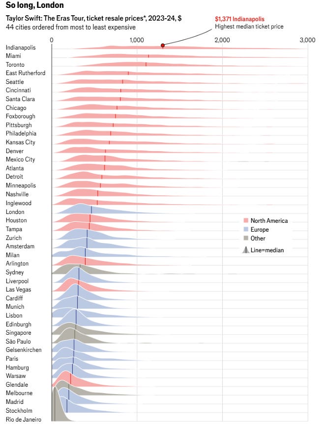 Taylor Swift’s Eras Tour, which began in March 2023, has sold over 10 million tickets for 149 shows across five continents. By the end of last year, it became the first tour to gross over $1 billion, with final earnings expected to double that. Prior to the tour, critics and fans criticized her for high ticket prices, which ranged from $49 to over $899 in the U.S. However, secondary-market prices suggest she could have charged more, with resale tickets averaging $839—exceeding face values for some top seats. She is projected to earn nearly $10 million per concert.
