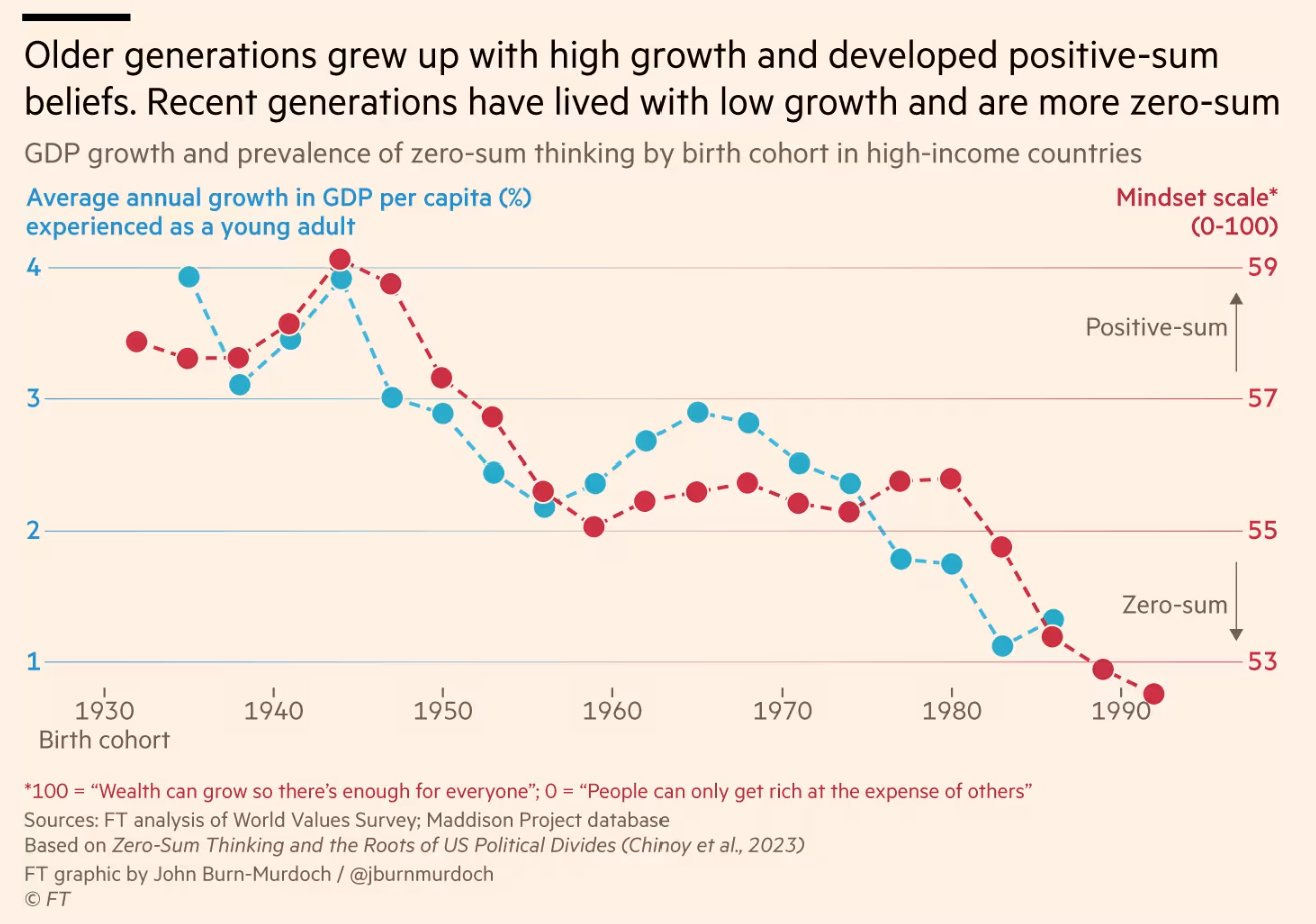 A frequently overlooked benefit of economic growth is that its absence turns the economy into a zero-sum game, where improving one's standard of living comes at the expense of others. Consequently, recent generations experiencing slower growth are increasingly inclined toward zero-sum thinking, likely contributing to the tensions observed in the West.