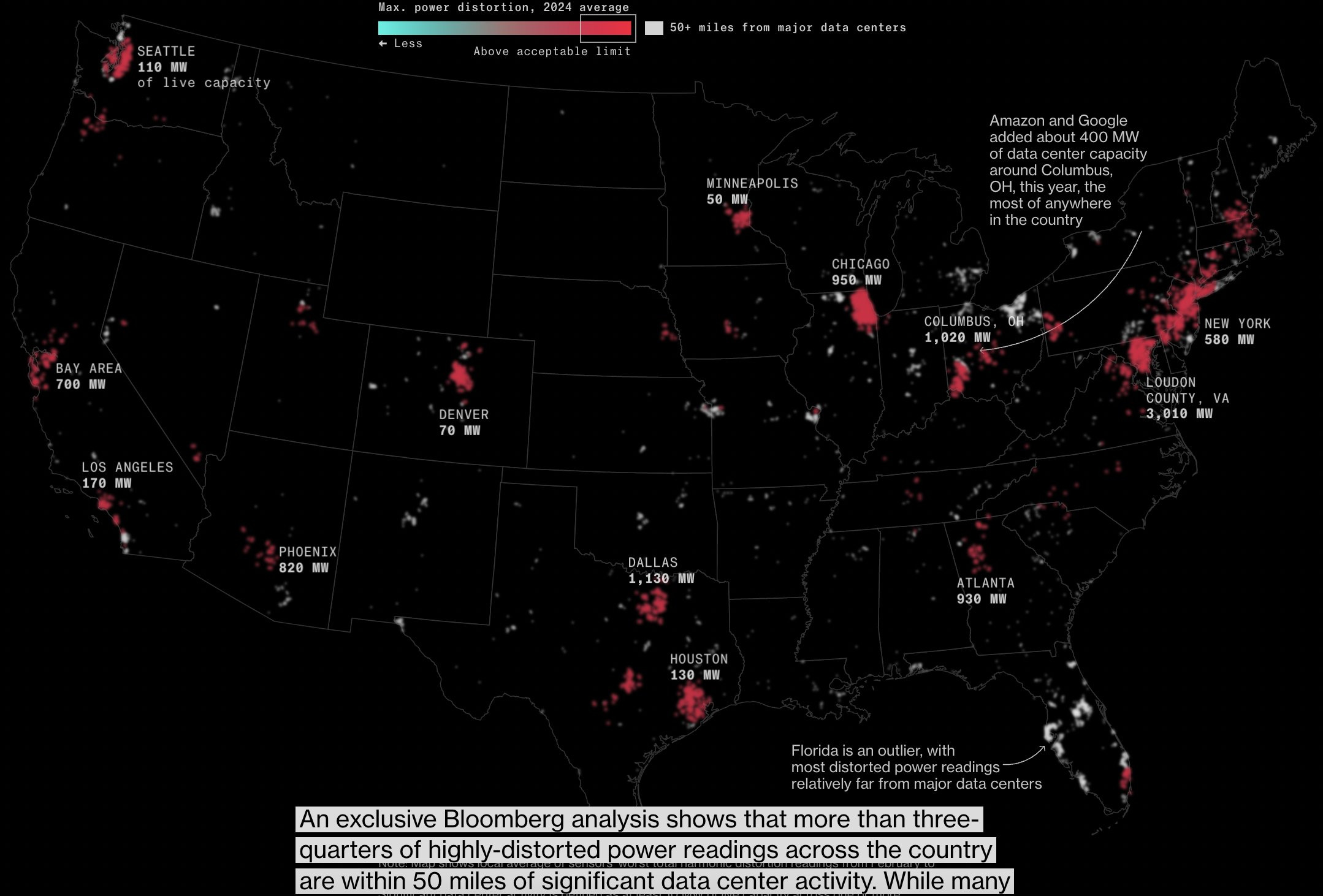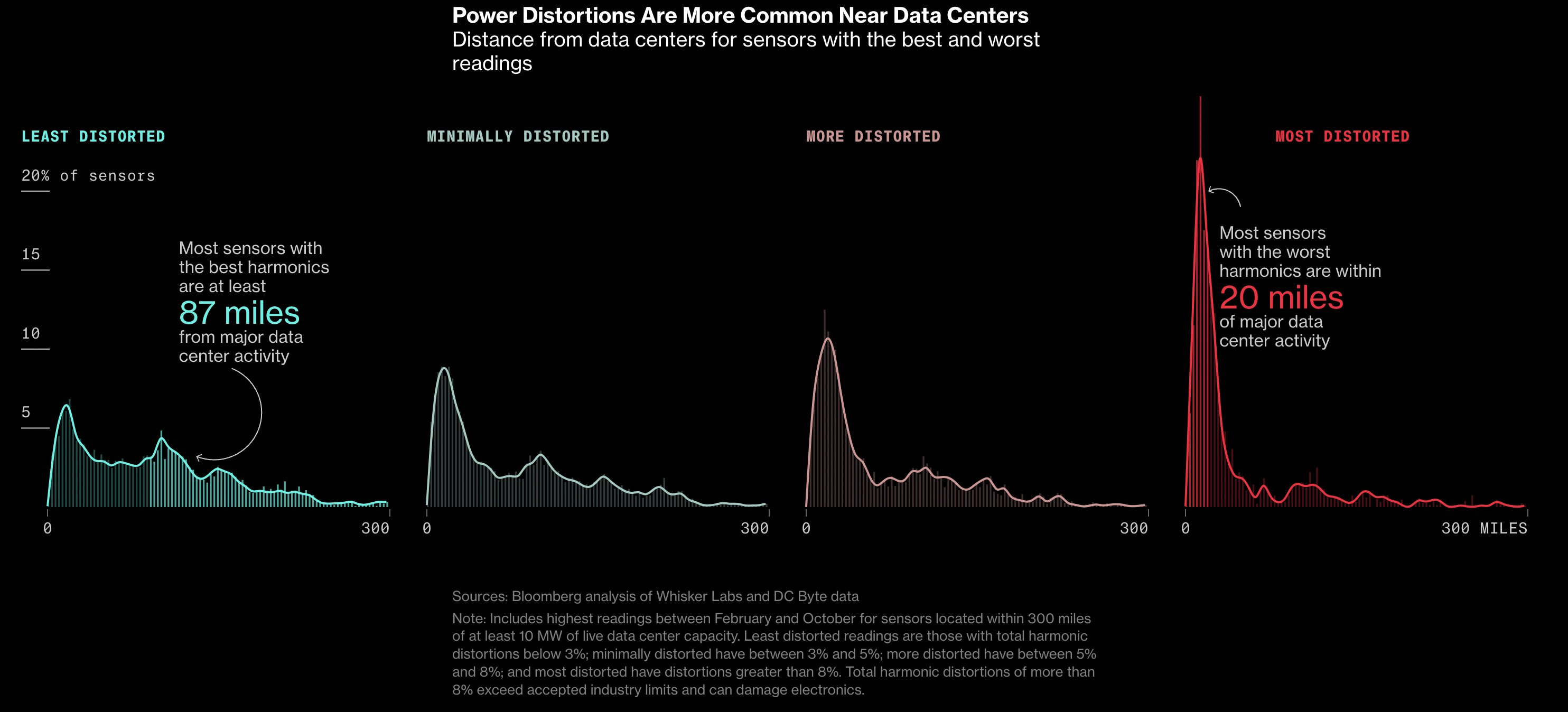 Expect to hear more about this. Over three-quarters of highly distorted power readings nationwide occur within 50 miles of significant data centers. This trend is evident both in major US cities and rural areas, adding stress to already fragile grids..