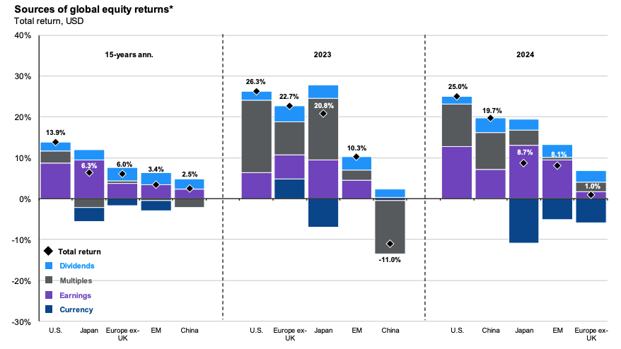 Decomposing return drivers over various time frames. In the short term, multiples can drive returns but in the long run, earnings do the lifting.