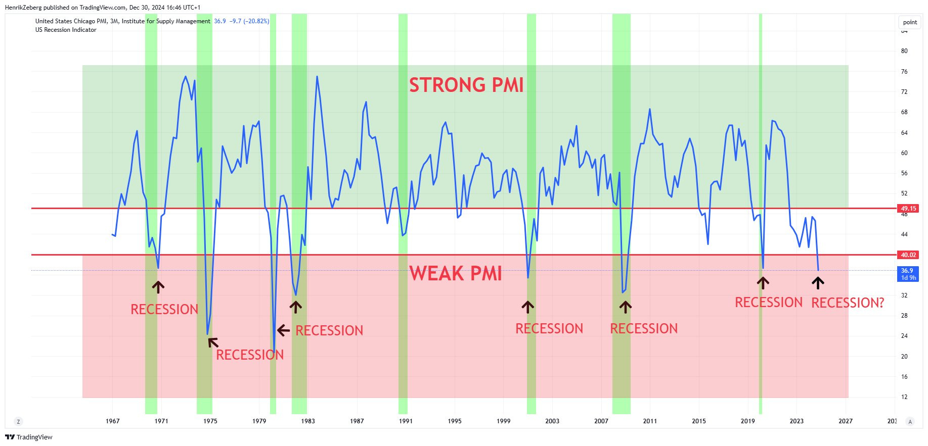 Two weeks ago, Powell mentioned the strength of the US economy; last week, the Chicago PMI recorded 36.9. These levels coincide with previous recessionary levels.